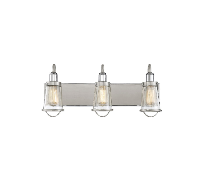 Lansing 3 badeværelseslampe udført i et design af poleret og satineret nikkel lakeret stål og med skærme i klart glas. Lampen er fra amerikanske Savoy House og anvender 3 x E27 lyskilder og måler 25 cm i højden og 61 x 18 cm i bredde og dybde/fremspring.