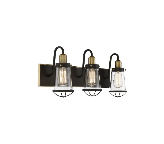 Lansing 3 badeværelseslampe udført i et design af varm messing og antik bronzelakeret stål og med skærme i klart glas. Lampen er fra amerikanske Savoy House og anvender 3 x E27 lyskilder og måler 25 cm i højden og 61 x 18 cm i bredde og dybde/fremspring.