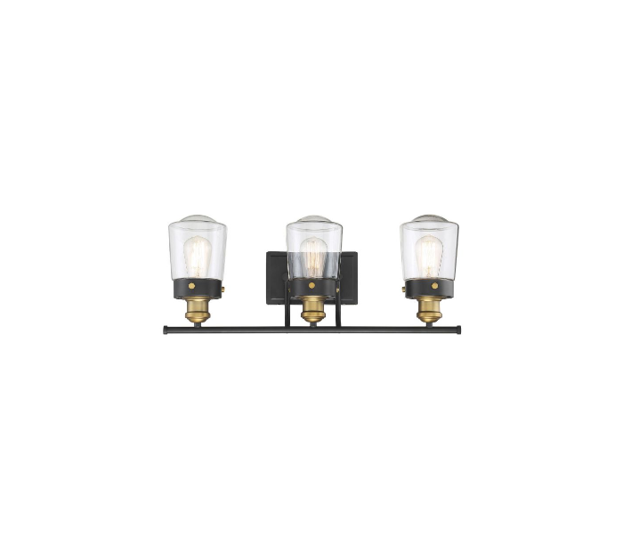 Macauley 3 badeværelseslampe udført i et design af varm messing og vintage sortlakeret stål og med skærme i klart glas. Lampen er fra amerikanske Savoy House og anvender 3 x E27 lyskilder og måler 25 cm i højden og 61 x 17 cm i bredde og dybde/fremspring.