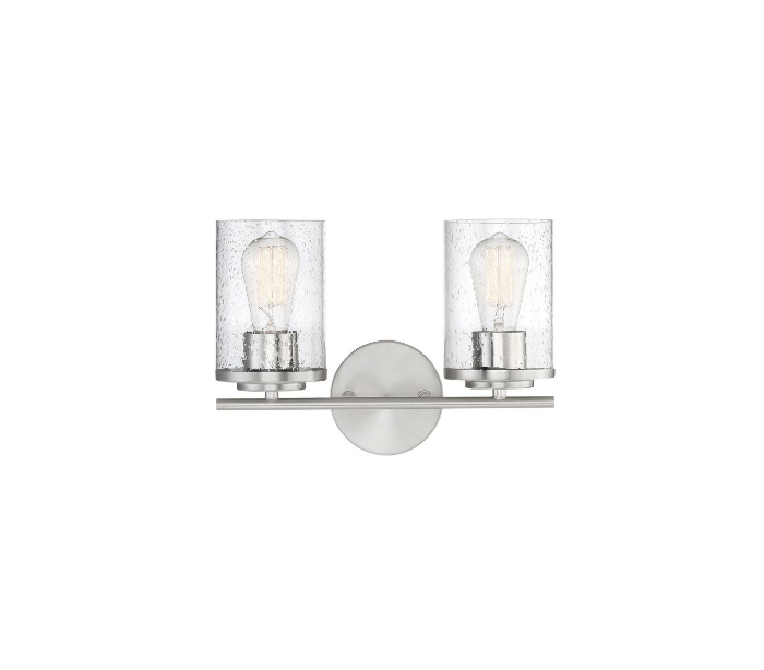 Marshall 2 badeværelseslampe udført i et design af kromlakeret stål og med skærme i klart glas med dråbe effekt. Lampen er fra amerikanske Savoy House og anvender 2 x E27 lyskilder og måler 24 cm i højden og 34 x 17 cm i bredde og dybde/fremspring.