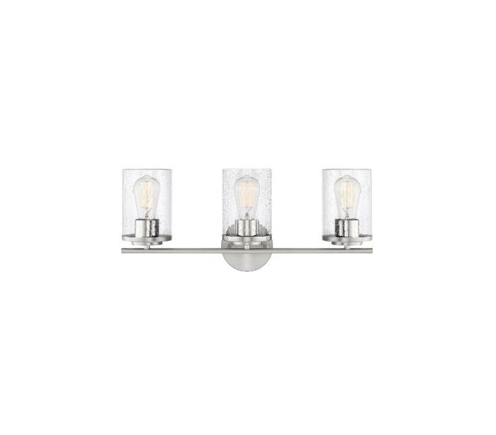Marshall 3 badeværelseslampe udført i et design af kromlakeret stål og med skærme i klart glas med dråbe effekt. Lampen er fra amerikanske Savoy House og anvender 3 x E27 lyskilder og måler 24 cm i højden og 56 x 17 cm i bredde og dybde/fremspring.