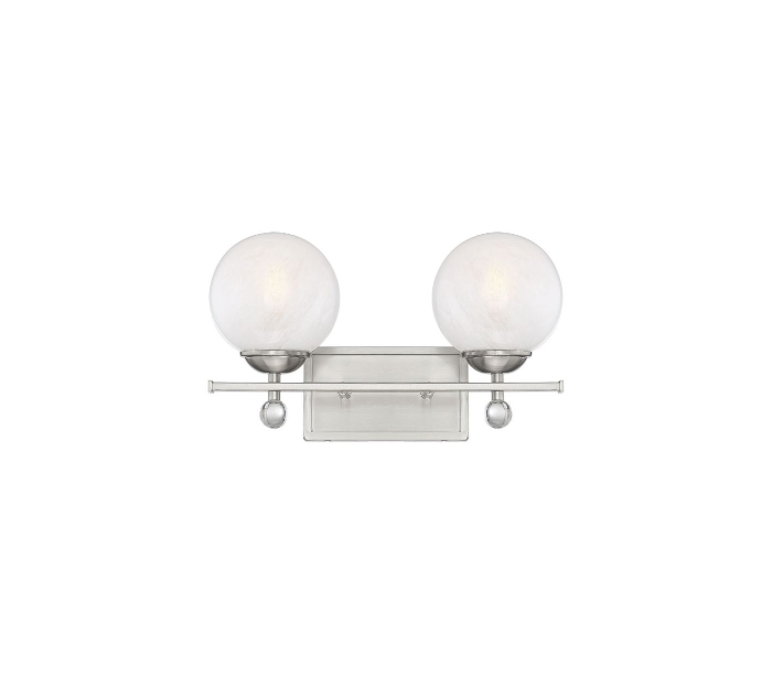 Medina 2 badeværelseslampe udført i et design af satineret nikkel lakeret stål og med skærme i frostet glas. Lampen er fra amerikanske Savoy House og anvender 2 x E14 lyskilder og måler 23 cm i højden og 41 x 19 cm i bredde og dybde/fremspring.