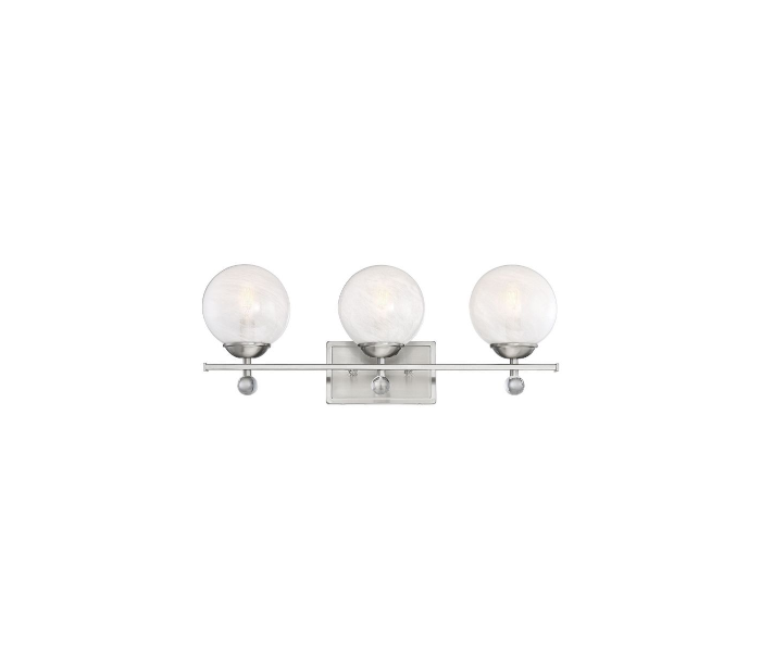 Medina 3 badeværelseslampe udført i et design af satineret nikkel lakeret stål og med skærme i frostet glas. Lampen er fra amerikanske Savoy House og anvender 3 x E14 lyskilder og måler 23 cm i højden og 61 x 19 cm i bredde og dybde/fremspring.