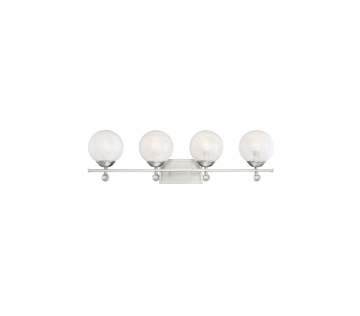 Medina 4 badeværelseslampe udført i et design af satineret nikkel lakeret stål og med skærme i frostet glas. Lampen er fra amerikanske Savoy House og anvender 4 x E14 lyskilder og måler 23 cm i højden og 81 x 19 cm i bredde og dybde/fremspring.