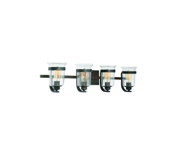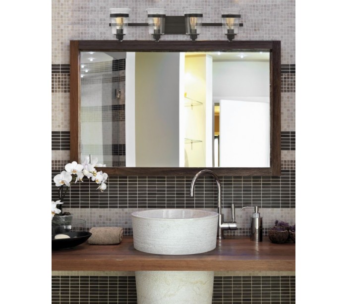 Goodwin 4 badeværelseslampe udført i et design af antik bronzelakeret stål og med skærme i klart glas med dråbe effekt. Lampen er fra amerikanske Savoy House og anvender 4 x E27 lyskilder og måler 20 cm i højden og 84 x 17 cm i bredde og dybde/fremspring.