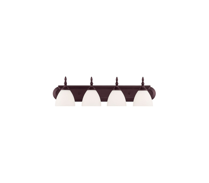 Herndon 4 badeværelseslampe udført i et design af antik bronzelakeret stål og med skærme i hvid opalglas. Lampen er fra amerikanske Savoy House og anvender 4 x E27 lyskilder og måler 20 cm i højden og 76 x 17 cm i bredde og dybde/fremspring.