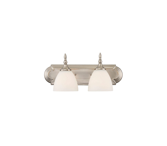 Herndon 2 badeværelseslampe udført i et design af satineret nikkel lakeret stål og med skærme i hvid opalglas. Lampen er fra amerikanske Savoy House og anvender 2 x E27 lyskilder og måler 20 cm i højden og 46 x 17 cm i bredde og dybde/fremspring.