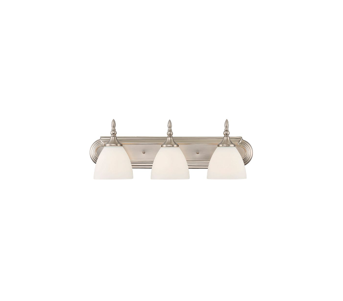 Herndon 3 badeværelseslampe udført i et design af satineret nikkel lakeret stål og med skærme i hvid opalglas. Lampen er fra amerikanske Savoy House og anvender 3 x E27 lyskilder og måler 20 cm i højden og 61 x 17 cm i bredde og dybde/fremspring.