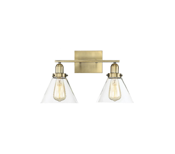 Drake 2 badeværelseslampe udført i et design af varm messinglakeret stål og med skærme i klart glas. Lampen er fra amerikanske Savoy House og anvender 2 x E27 lyskilder og måler 25 cm i højden og 45 x 19 cm i bredde og dybde/fremspring.