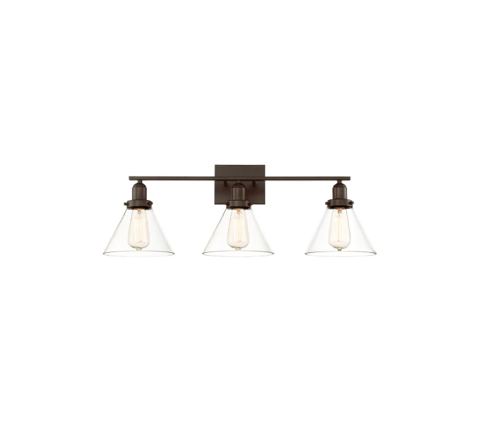 Drake 3 badeværelseslampe udført i et design af antik bronzelakeret stål og med skærme i klart glas. Lampen er fra amerikanske Savoy House og anvender 3 x E27 lyskilder og måler 25 cm i højden og 72 x 19 cm i bredde og dybde/fremspring.