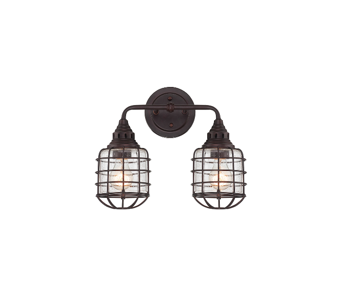 Connell 2 badeværelseslampe udført i et design af antik bronzelakeret stål og med skærme i klart glas med dråbe effekt. Lampen er fra amerikanske Savoy House og anvender 2 x E27 lyskilder og måler 32 cm i højden og 38 x 18 cm i bredde og dybde/fremspring.