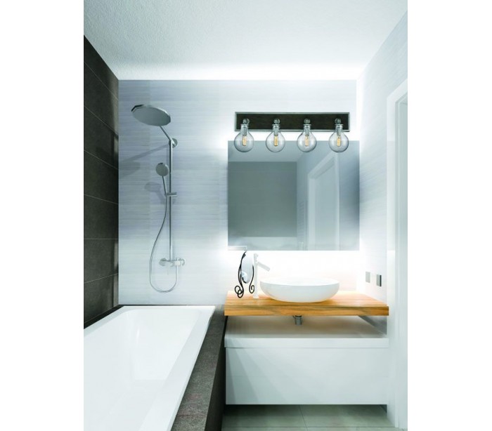 Dansk 3 badeværelseslampe udført i et design af galvaniseret metalgrålakeret stål og med skærme i klart glas med dråbe effekt. Lampen er fra amerikanske Savoy House og anvender 3 x E14 lyskilder og måler 27 cm i højden og 54 x 15 cm i bredde og dybde/fremspring.