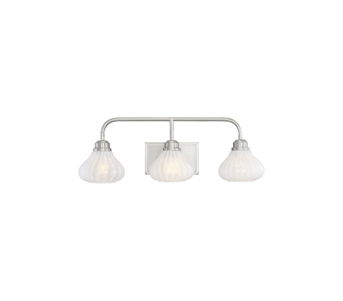 Darlington 3 badeværelseslampe udført i et design af satineret nikkel lakeret stål og med skærme i hvid opalglas. Lampen er fra amerikanske Savoy House og anvender 3 x E27 lyskilder og måler 22 cm i højden og 65 x 20 cm i bredde og dybde/fremspring.