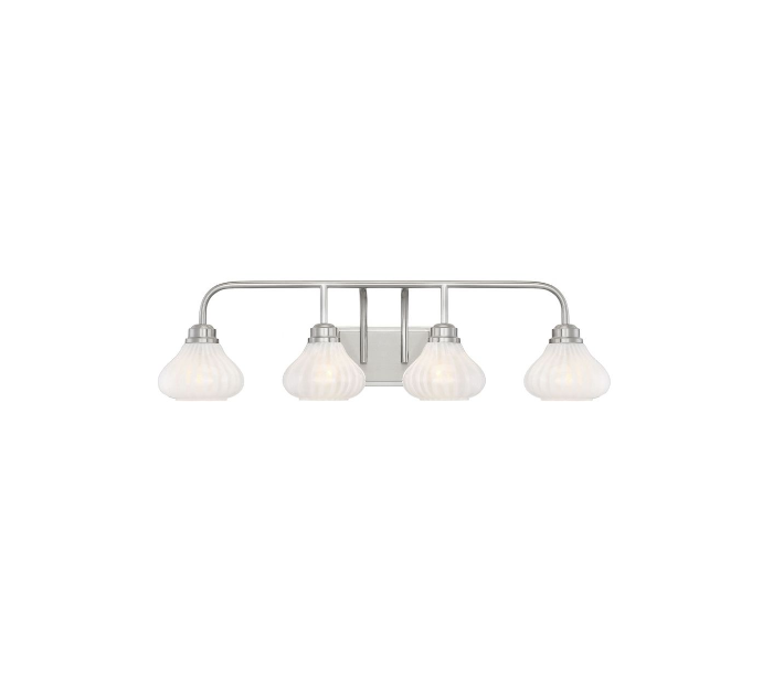 Darlington 4 badeværelseslampe udført i et design af satineret nikkel lakeret stål og med skærme i hvid opalglas. Lampen er fra amerikanske Savoy House og anvender 4 x E27 lyskilder og måler 22 cm i højden og 86 x 20 cm i bredde og dybde/fremspring.