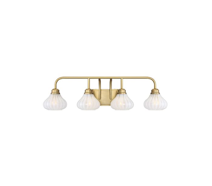 Darlington 4 badeværelseslampe udført i et design af varm messinglakeret stål og med skærme i hvid opalglas. Lampen er fra amerikanske Savoy House og anvender 4 x E27 lyskilder og måler 22 cm i højden og 86 x 20 cm i bredde og dybde/fremspring.