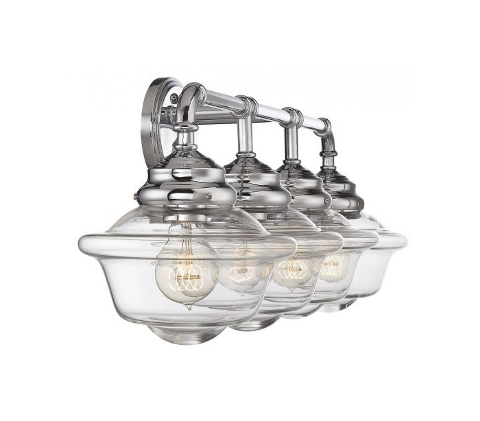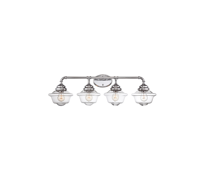 Fairfield 4 badeværelseslampe udført i et design af poleret kromlakeret stål og med skærme i klart glas. Lampen er fra amerikanske Savoy House og anvender 4 x E27 lyskilder og måler 28 cm i højden og 88 x 23 cm i bredde og dybde/fremspring.