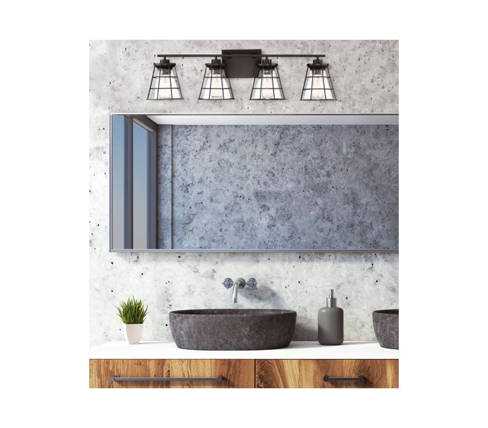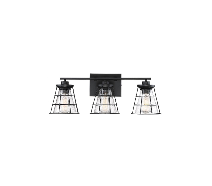 Farnham 3 badeværelseslampe udført i et design af mat sortlakeret stål og med skærme i klart glas med dråbe effekt. Lampen er fra amerikanske Savoy House og anvender 3 x E27 lyskilder og måler 23 cm i højden og 61 x 18 cm i bredde og dybde/fremspring.