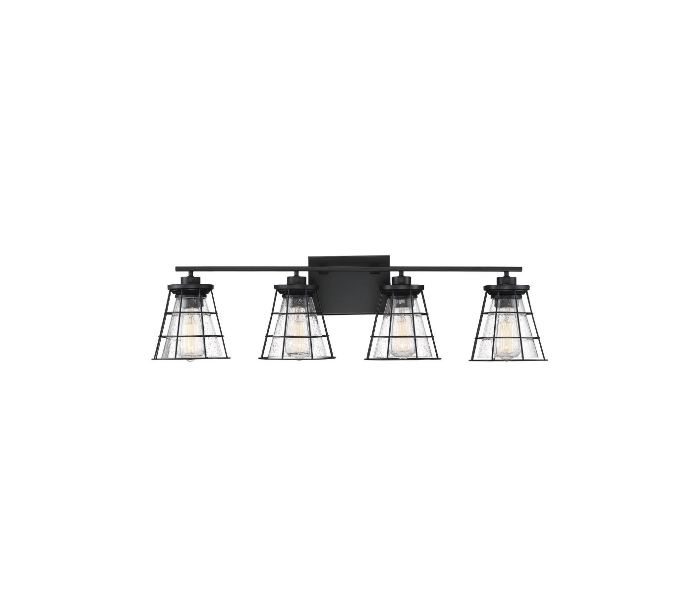 Farnham 4 badeværelseslampe udført i et design af mat sortlakeret stål og med skærme i klart glas med dråbe effekt. Lampen er fra amerikanske Savoy House og anvender 4 x E27 lyskilder og måler 23 cm i højden og 84 x 18 cm i bredde og dybde/fremspring.