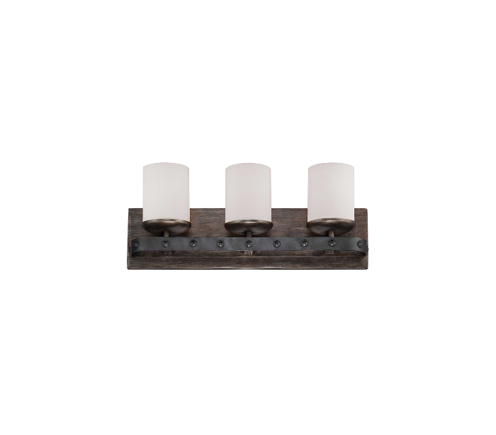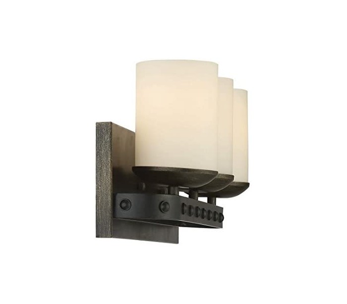 Alsace 3 badeværelseslampe udført i et design af rustik naturfarvet genanvendt træ og antik sortlakeret stål og med skærme i hvid opalglas. Lampen er fra amerikanske Savoy House og anvender 3 x E27 lyskilder og måler 22 cm i højden og 53 x 13 cm i bredde og dybde/fremspring.