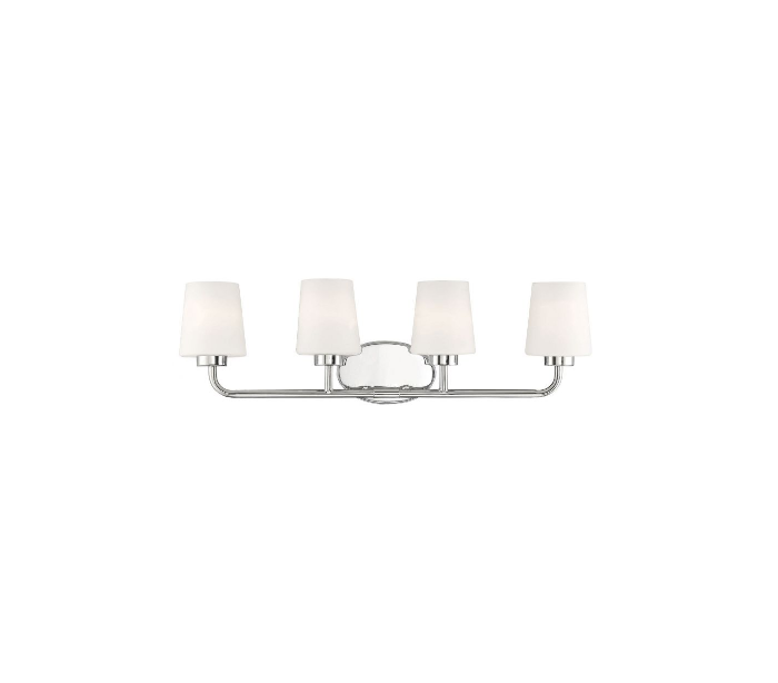 Capra 4 badeværelseslampe udført i et design af poleret nikkel lakeret stål og med skærme i frostet hvid glas. Lampen er fra amerikanske Savoy House og anvender 4 x E27 lyskilder og måler 23 cm i højden og 79 x 14 cm i bredde og dybde/fremspring.