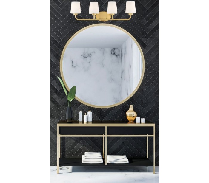 Capra 4 badeværelseslampe udført i et design af varm messinglakeret stål og med skærme i frostet hvid glas. Lampen er fra amerikanske Savoy House og anvender 4 x E27 lyskilder og måler 23 cm i højden og 79 x 14 cm i bredde og dybde/fremspring.