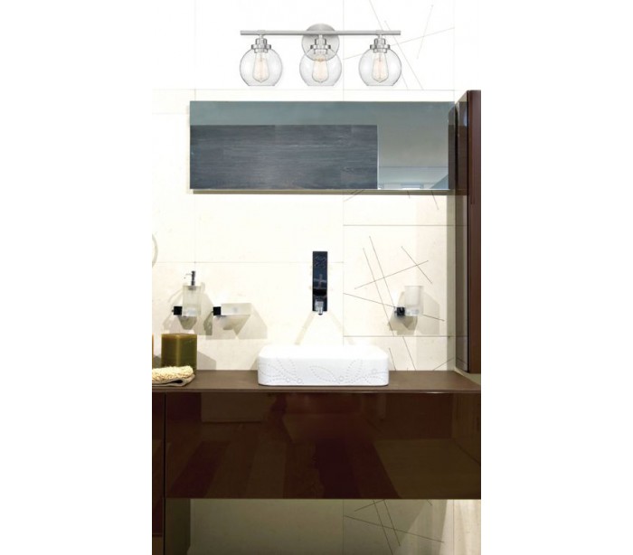 Carson 1 badeværelseslampe udført i et design af satineret nikkel lakeret stål og med skærm i klart glas. Lampen er fra amerikanske Savoy House og anvender 1 x E27 lyskilde og måler 22 cm i højden og 14 x 18 cm i bredde og dybde/fremspring.