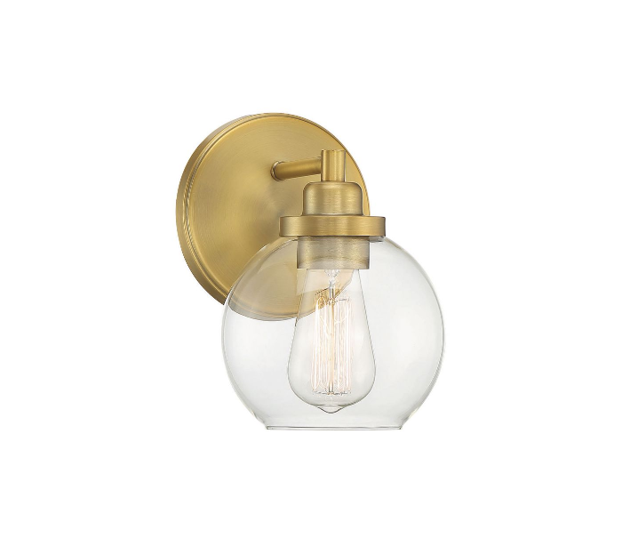 Carson 1 badeværelseslampe udført i et design af varm messinglakeret stål og med skærm i klart glas. Lampen er fra amerikanske Savoy House og anvender 1 x E27 lyskilde og måler 22 cm i højden og 14 x 18 cm i bredde og dybde/fremspring.