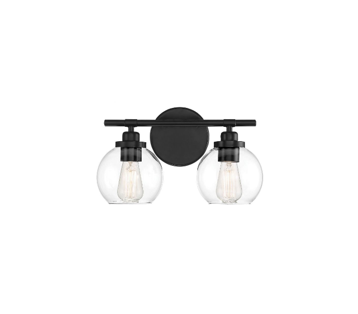 Carson 2 badeværelseslampe udført i et design af mat sortlakeret stål og med skærme i klart glas. Lampen er fra amerikanske Savoy House og anvender 2 x E27 lyskilder og måler 22 cm i højden og 36 x 18 cm i bredde og dybde/fremspring.