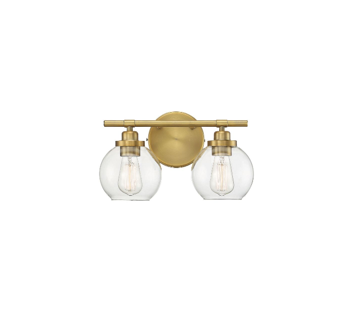 Carson 2 badeværelseslampe udført i et design af varm messinglakeret stål og med skærme i klart glas. Lampen er fra amerikanske Savoy House og anvender 2 x E27 lyskilder og måler 22 cm i højden og 36 x 18 cm i bredde og dybde/fremspring.