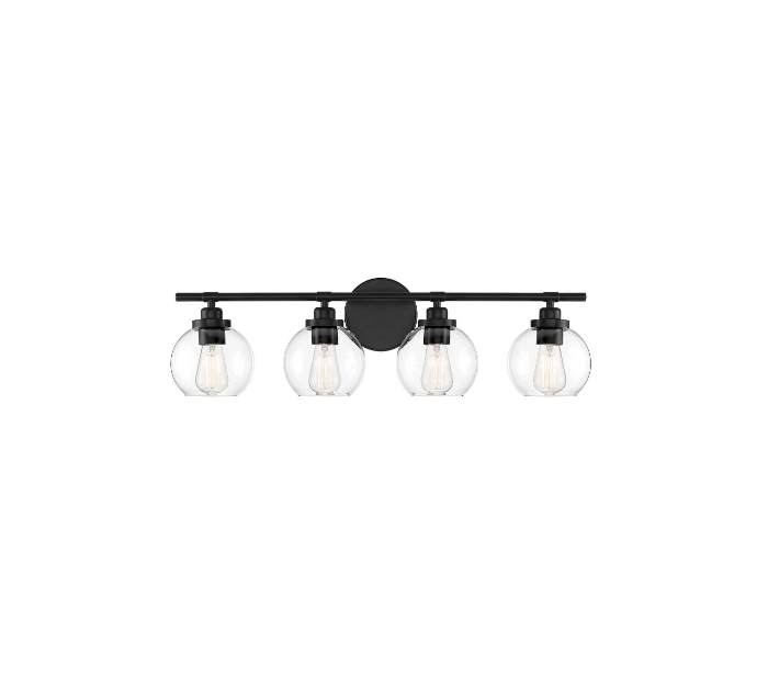Carson 4 badeværelseslampe udført i et design af mat sortlakeret stål og med skærme i klart glas. Lampen er fra amerikanske Savoy House og anvender 4 x E27 lyskilder og måler 22 cm i højden og 76 x 18 cm i bredde og dybde/fremspring.