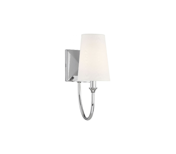 Cameron 1 badeværelseslampe udført i et design af poleret nikkel lakeret stål og med skærm i hvid tekstil. Lampen er fra amerikanske Savoy House og anvender 1 x G9 lyskilde og måler 33 cm i højden og 13 x 20 cm i bredde og dybde/fremspring.