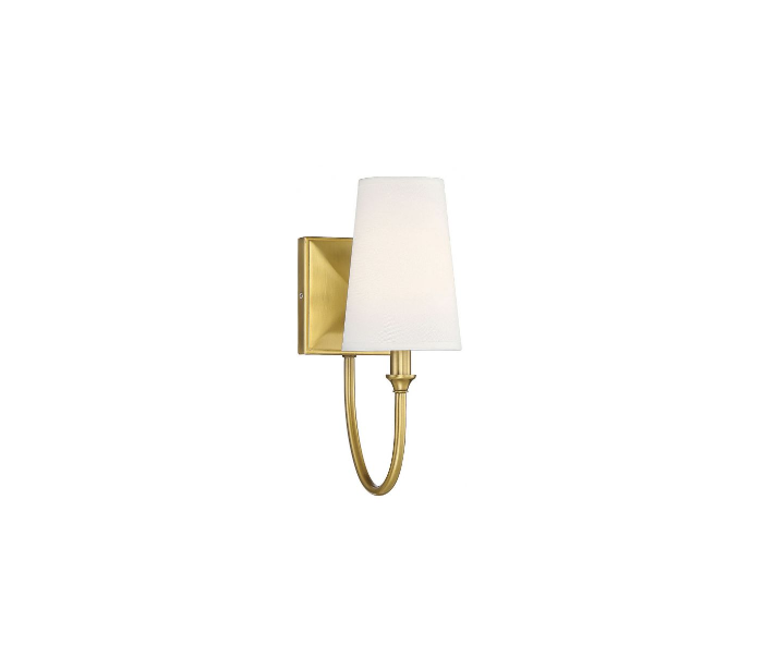 Cameron 1 badeværelseslampe udført i et design af varm messinglakeret stål og med skærm i hvid tekstil. Lampen er fra amerikanske Savoy House og anvender 1 x G9 lyskilde og måler 33 cm i højden og 13 x 20 cm i bredde og dybde/fremspring.