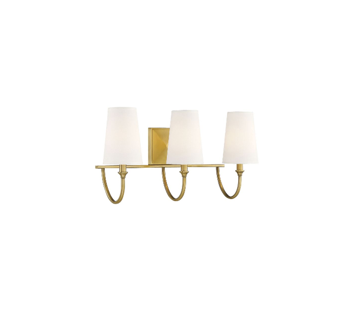 Cameron 3 badeværelseslampe udført i et design af varm messinglakeret stål og med skærme i hvid tekstil. Lampen er fra amerikanske Savoy House og anvender 3 x G9 lyskilder og måler 30 cm i højden og 61 x 20 cm i bredde og dybde/fremspring.