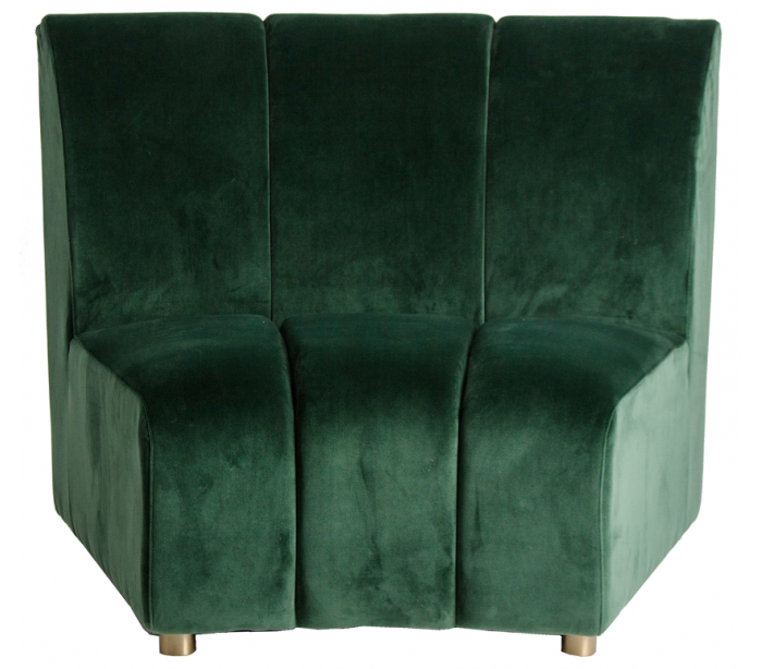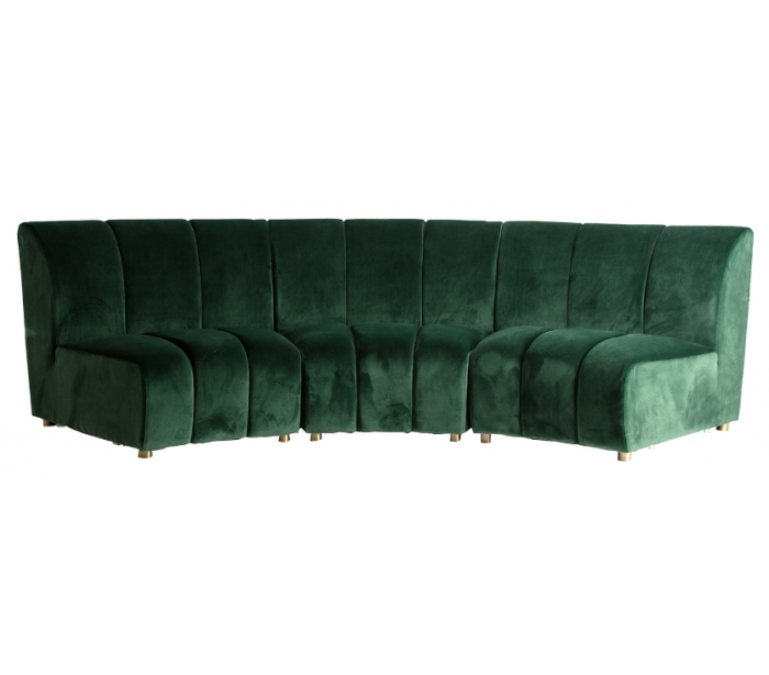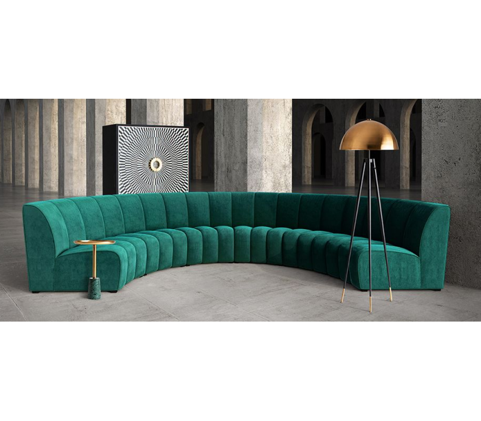 Bænk i et moderne afrundet design, fremstillet i grøn velour. Bænken måler 84 cm i højden og 109 cm i bredden og kan med fordel sammensættes i flere bænke.