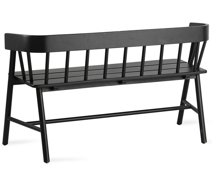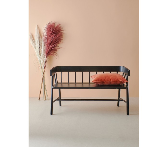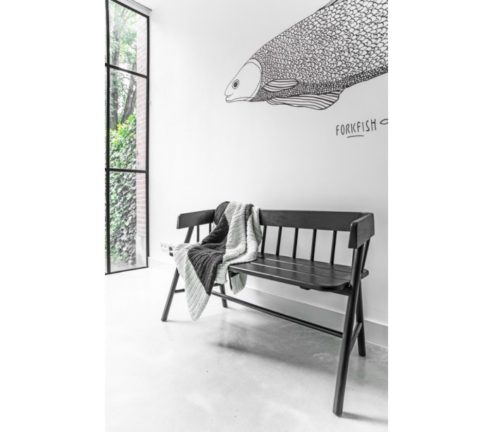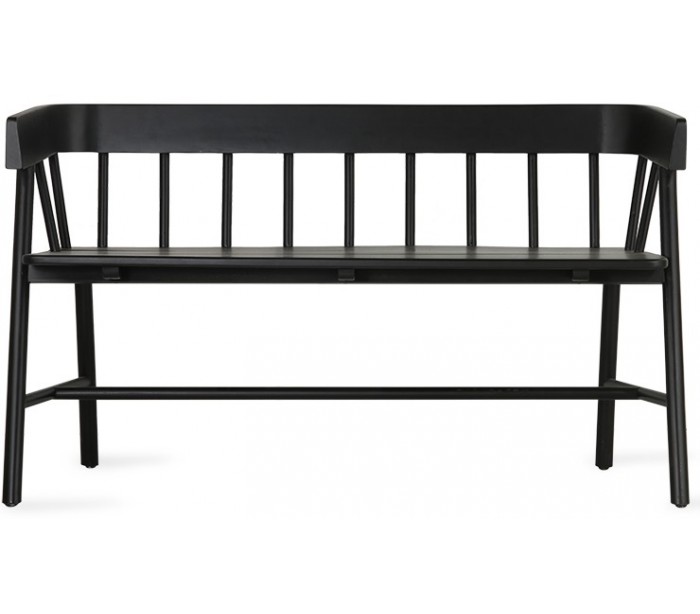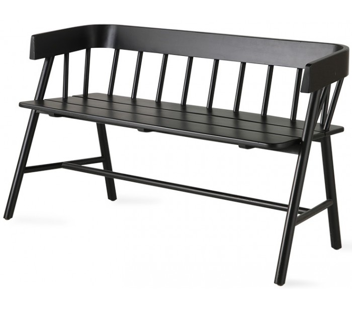 Bænk i et design fremstillet i sortlakeret teaktræ. Bænken måler 72 cm i højden over ryggen og med en bredde på 123 cm.