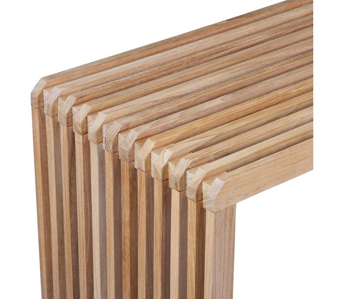 Bænk i et design fremstillet i naturfarvet teaktræ. Bænken måler 45 cm i højden og 160 cm i bredden.