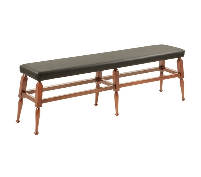 Bænk fra Authentic Models, udført i et design af honningbrun lakeret mahognitræ og sort PU-læder og måler 150 cm i bredden.