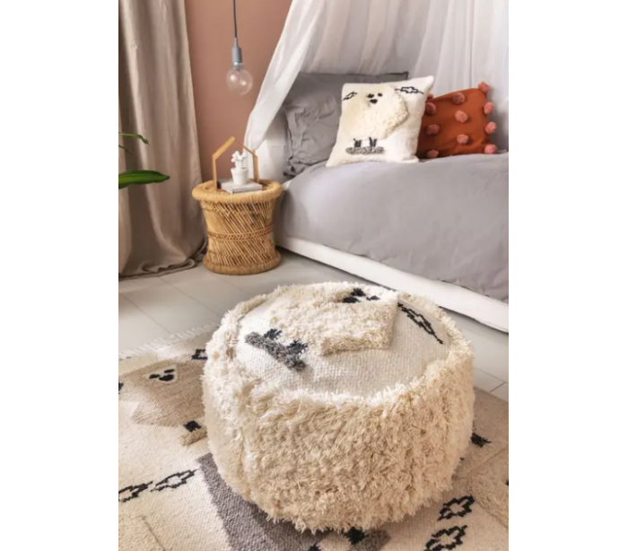 Smart puf til børneværelset eller stuen, udført i et design af uld og polyester. Puffen måler 25 cm i højden og 45 cm i diameter.