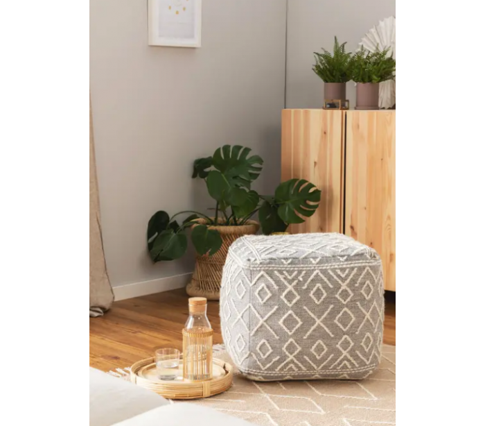 Smart puf til børneværelset eller stuen, udført i et design af bomuld og uld. Puffen måler 45 cm i højde, bredde og dybde.