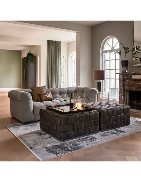 Riviera Maison bænk i et design af espressofarvet pellini læder og industrielt grålakeret metal. Bænken måler 42 cm i højden og 87 x 87 cm i bredde og dybde.