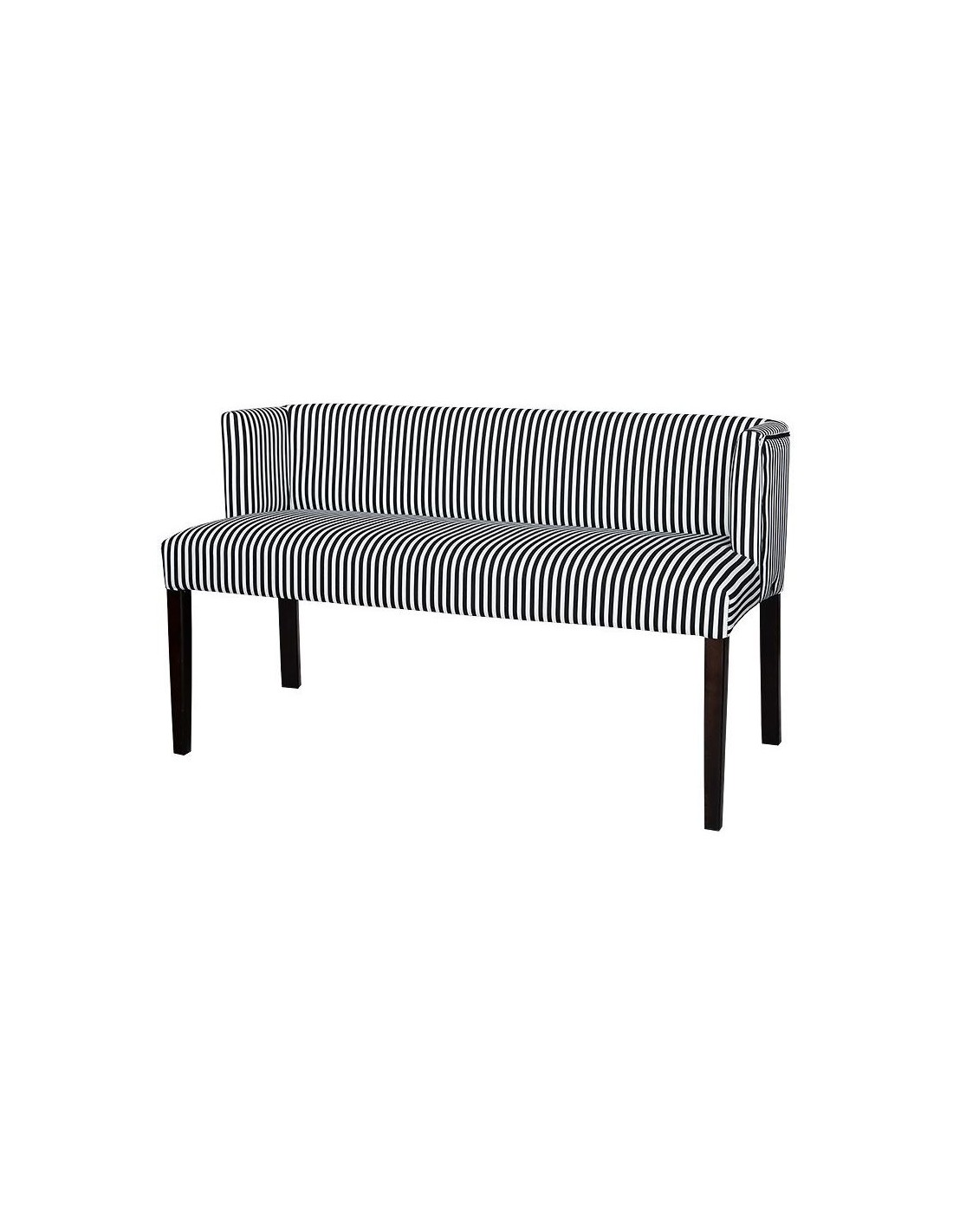Bænk udført i et moderne design af sort og hvid stribet polyester og med ben i sortlakeret træ. Bænken måler 125 cm i bredden, 68 cm i højden over ryggen og med en siddehøjde på 45 cm.