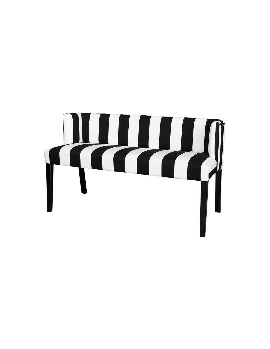 Bænk udført i et moderne design af sort og hvid stribet polyester og med ben i sortlakeret træ. Bænken måler 125 cm i bredden, 68 cm i højden over ryggen og med en siddehøjde på 45 cm.