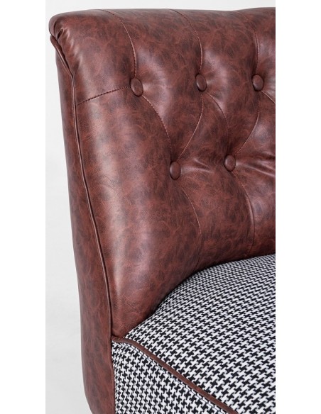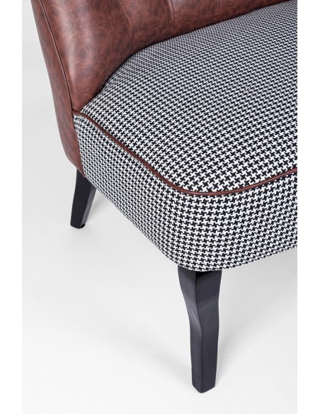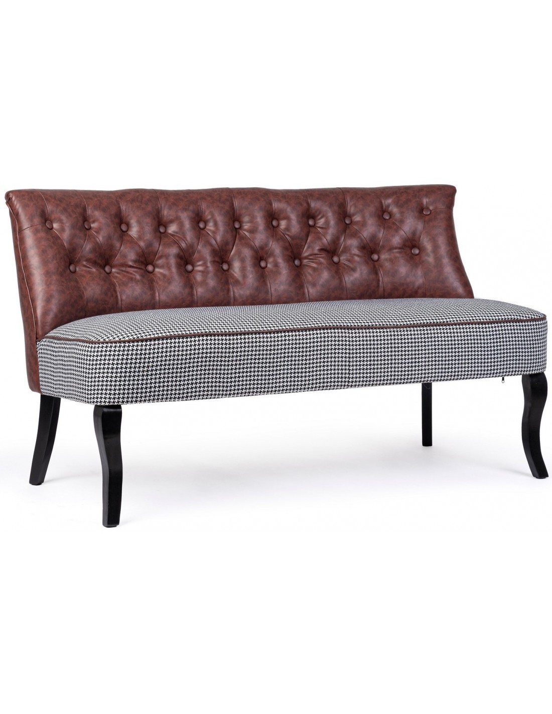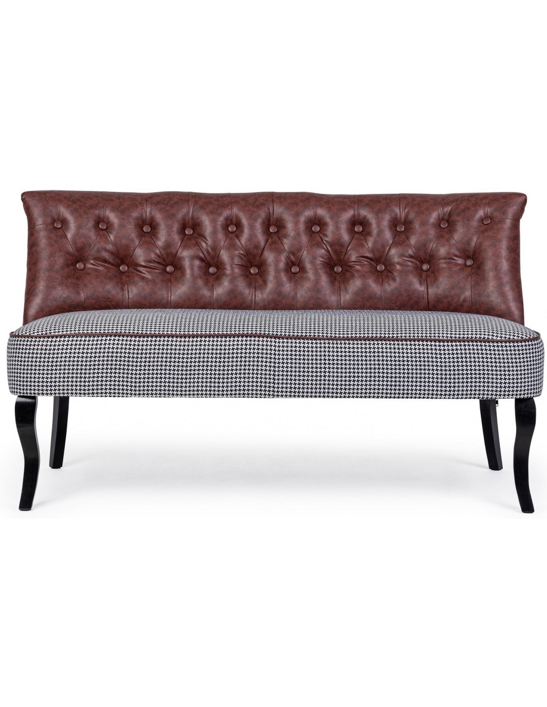 Bænk udført i et moderne design af sortlakeret træ, ternet polyester og rødbrun PU-læder. Bænken måler 76 cm i højden og 136 x 66 cm i bredde og dybde. Siddehøjden er 48 cm.