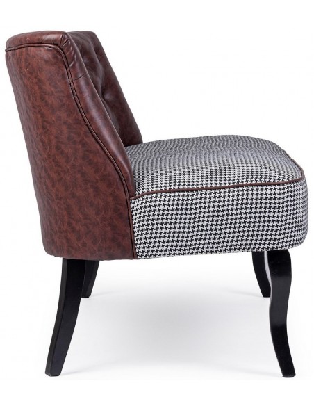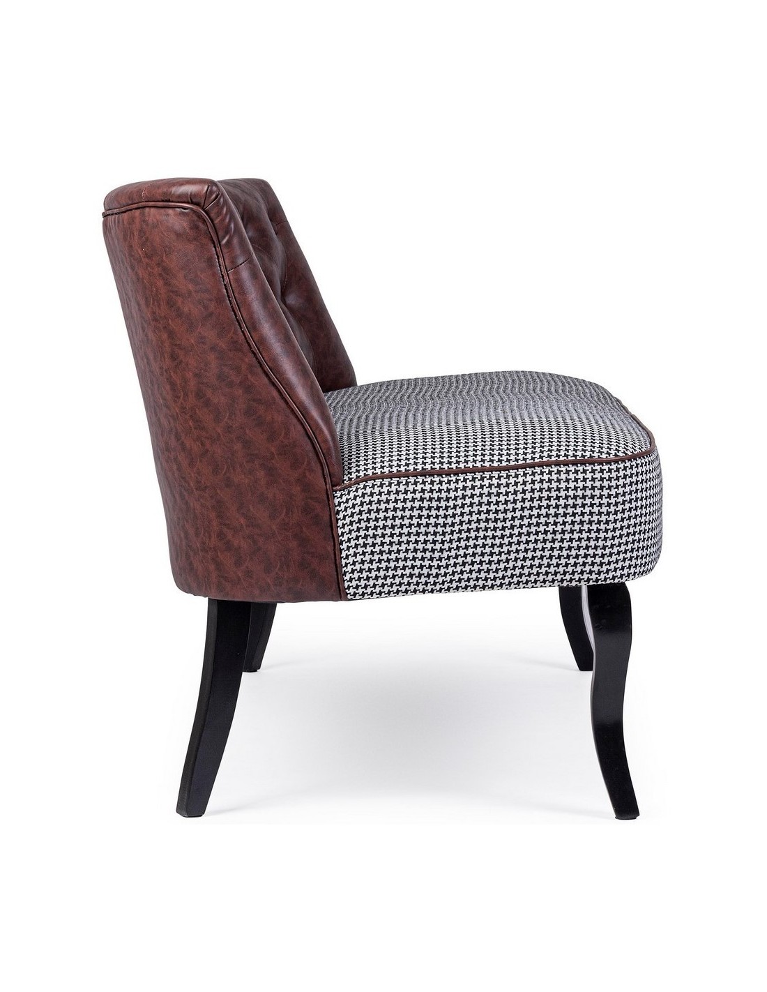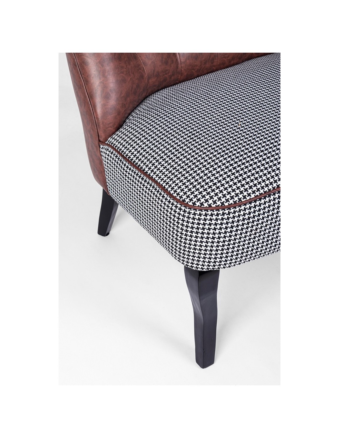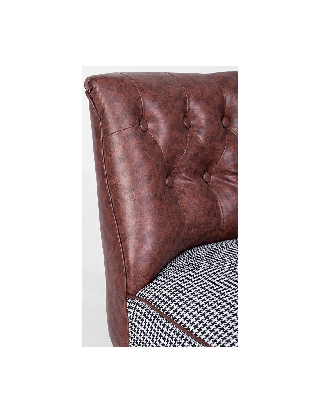 Bænk udført i et moderne design af sortlakeret træ, ternet polyester og rødbrun PU-læder. Bænken måler 76 cm i højden og 136 x 66 cm i bredde og dybde. Siddehøjden er 48 cm.