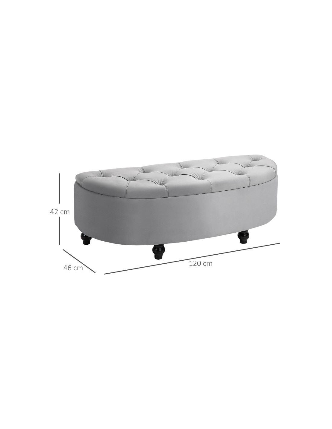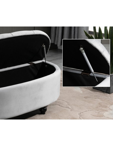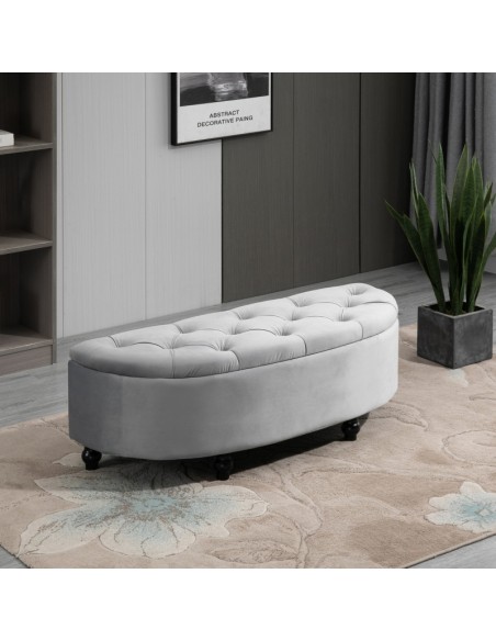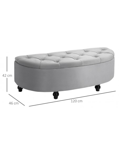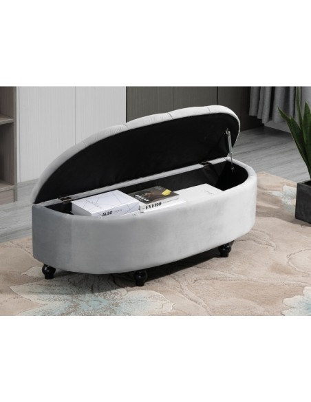Bænk med opbevaring, udført i et design af velpolstret velour og med ben i træ. Bænken måler 120 x 46 cm i bredde og dybde.