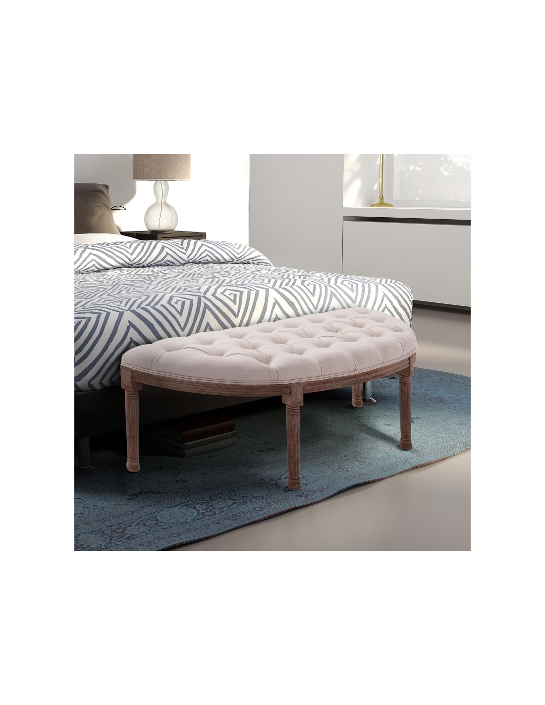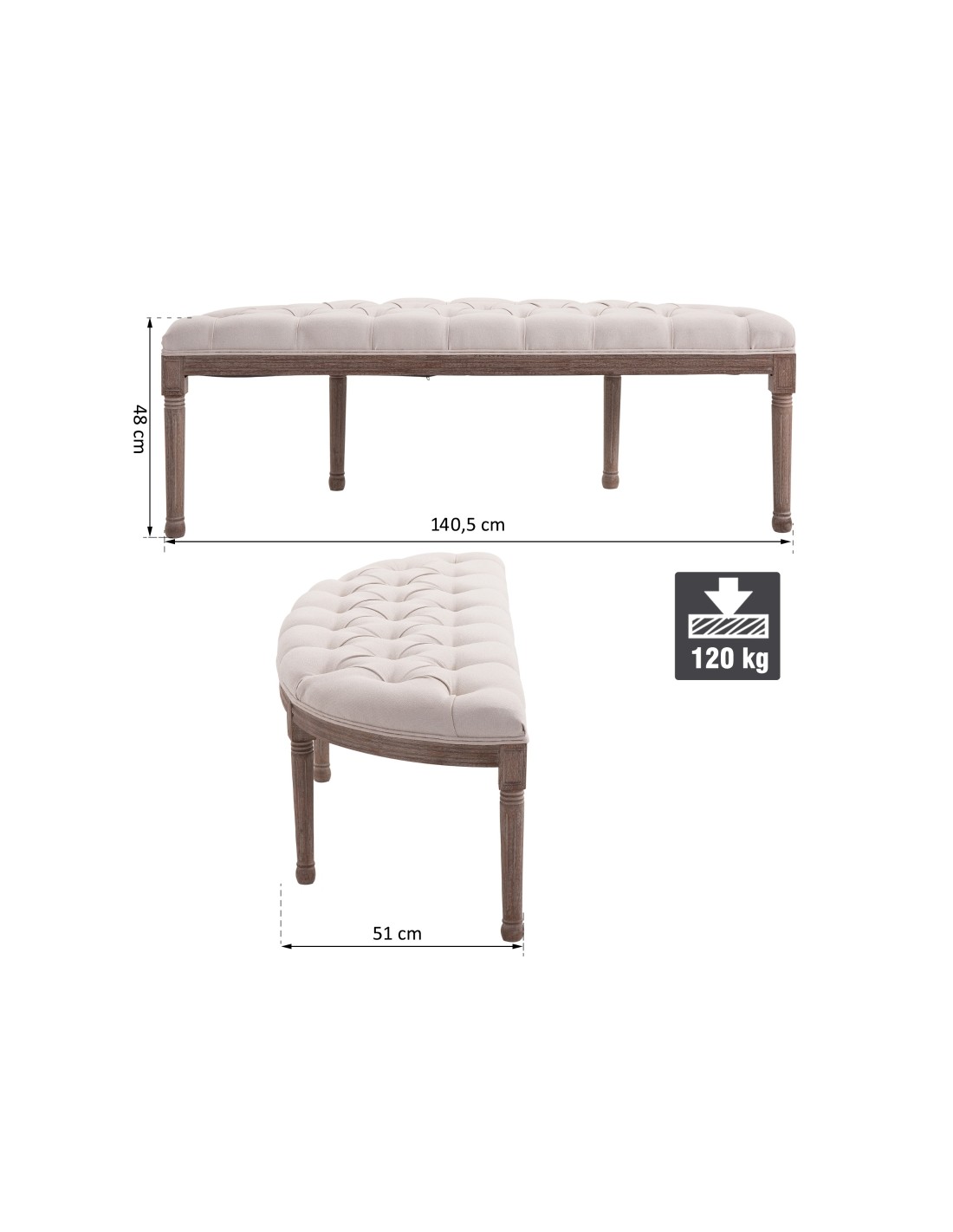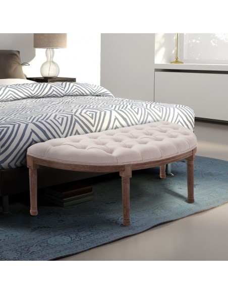 Bænk udført i et design af velpolstret linned og med ben i træ. Bænken måler 140,5 x 51 cm i bredde og dybde.