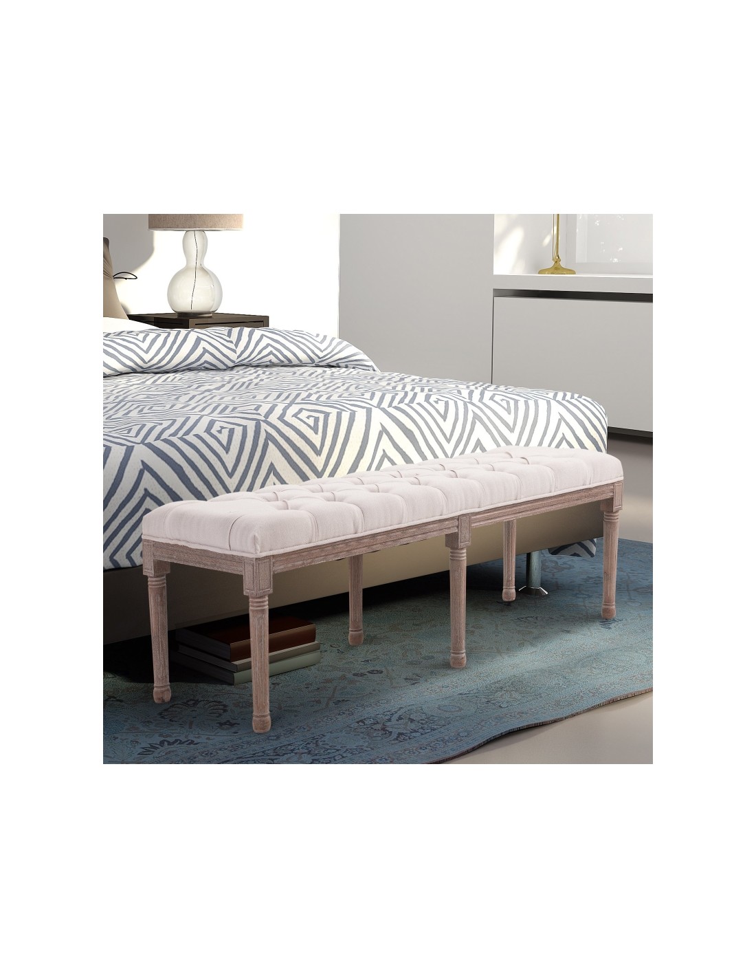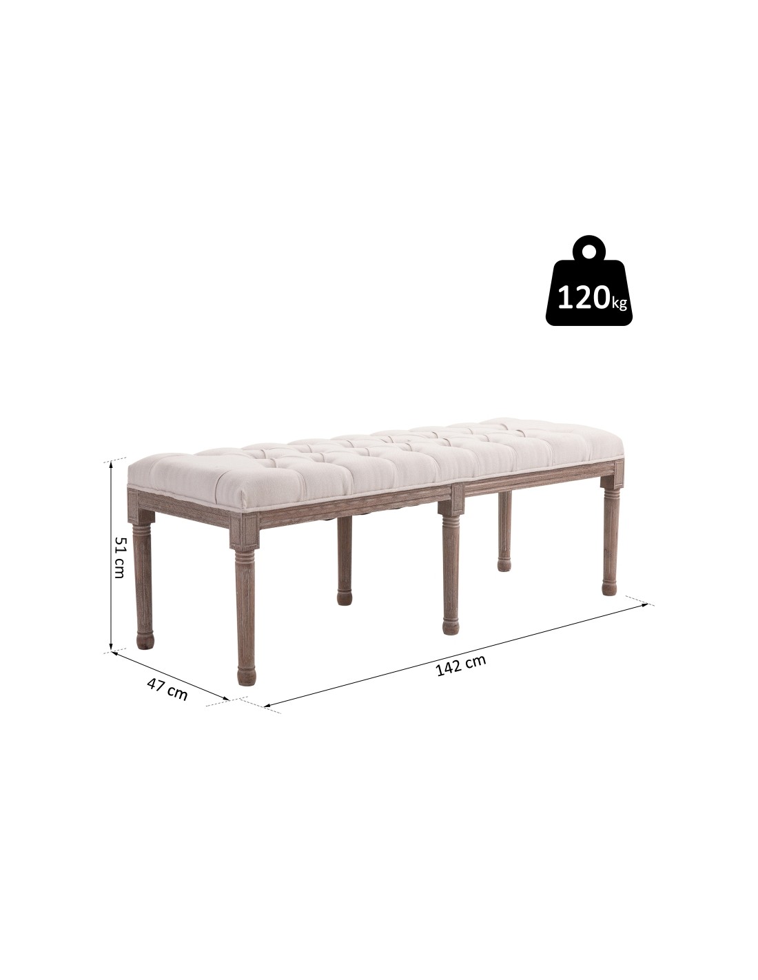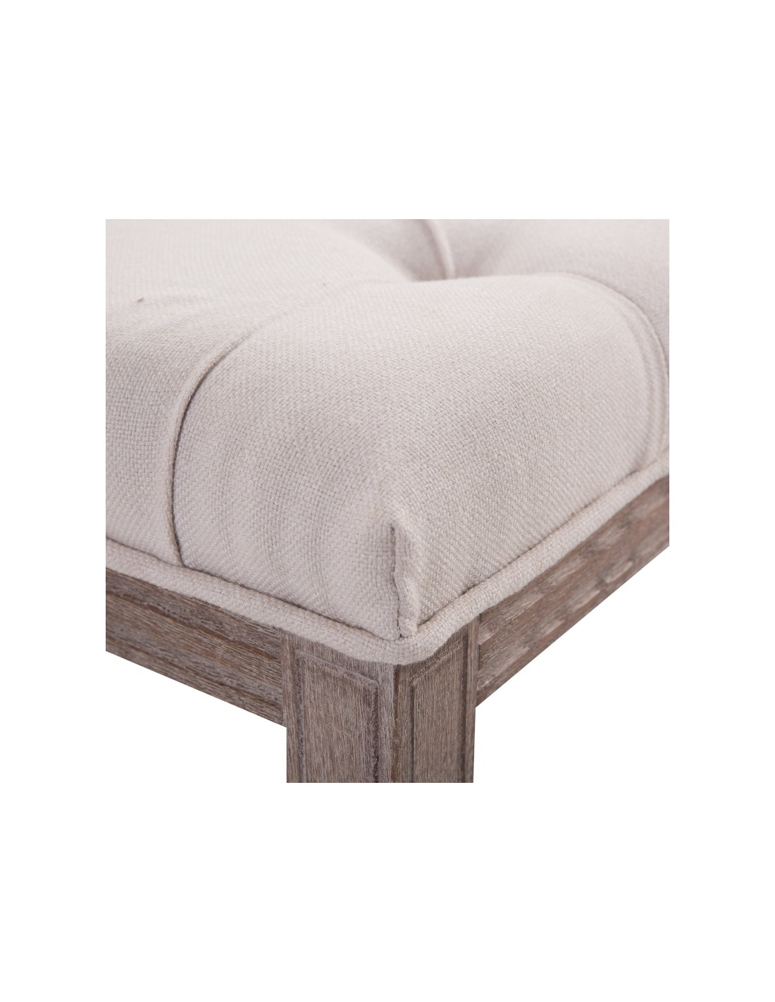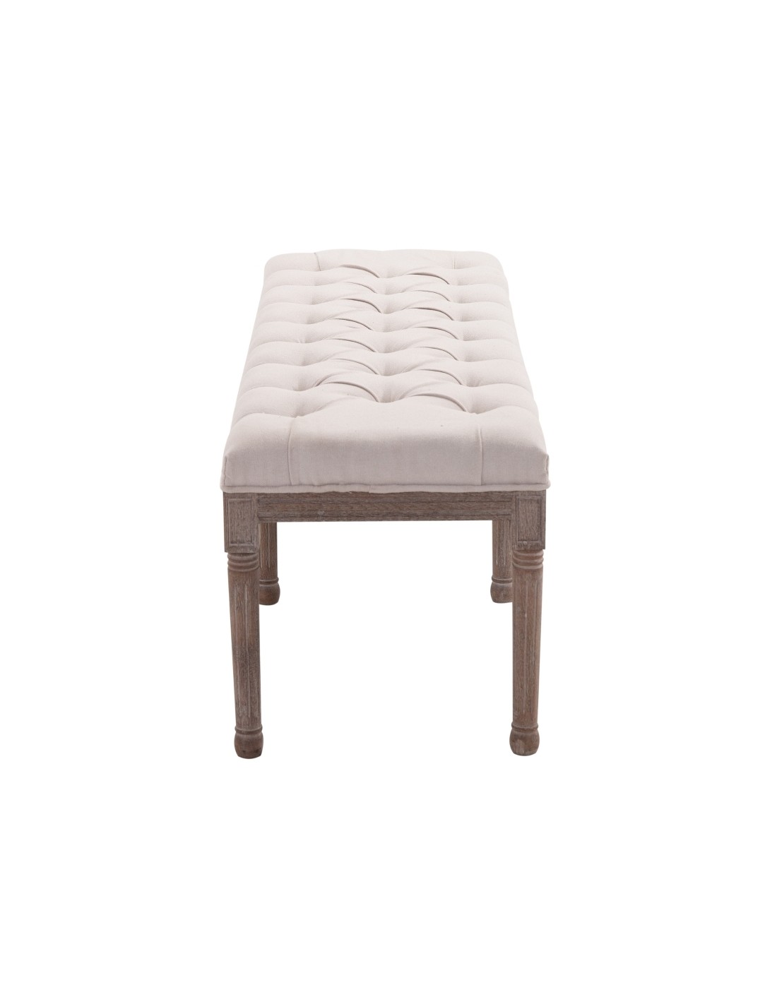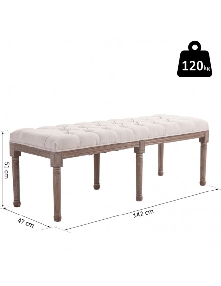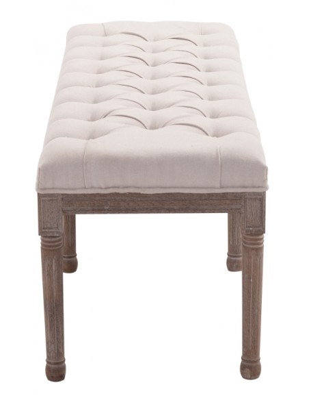Bænk udført i et design af velpolstret linned og med ben i træ. Bænken måler 142 x 47 cm i bredde og dybde.
