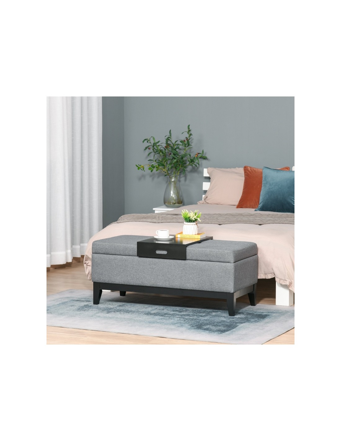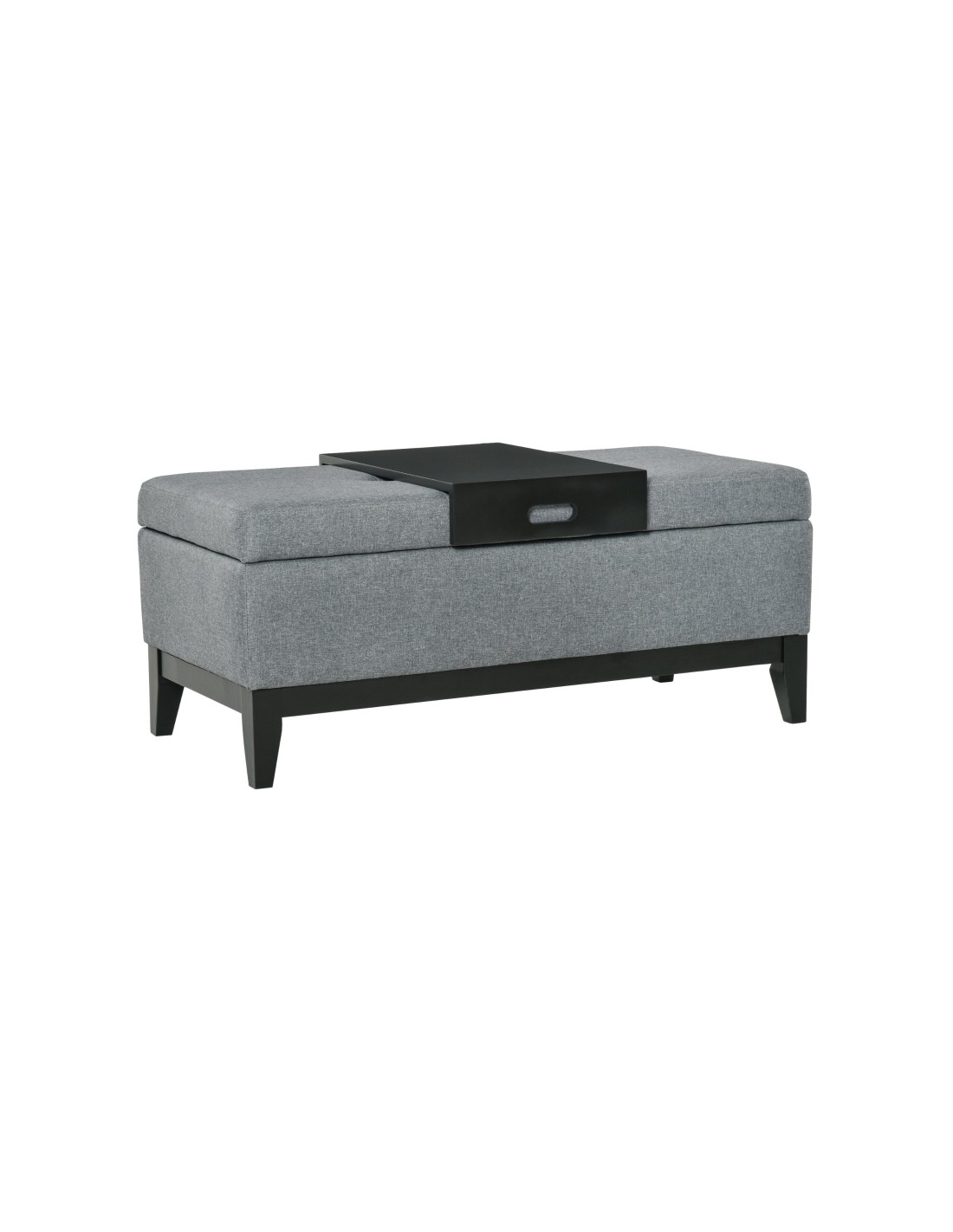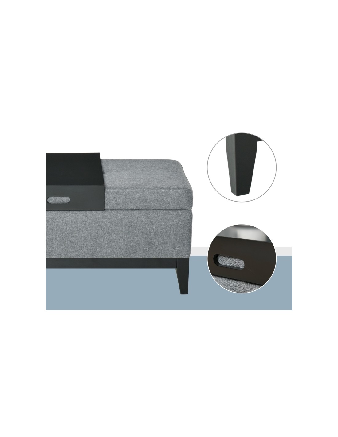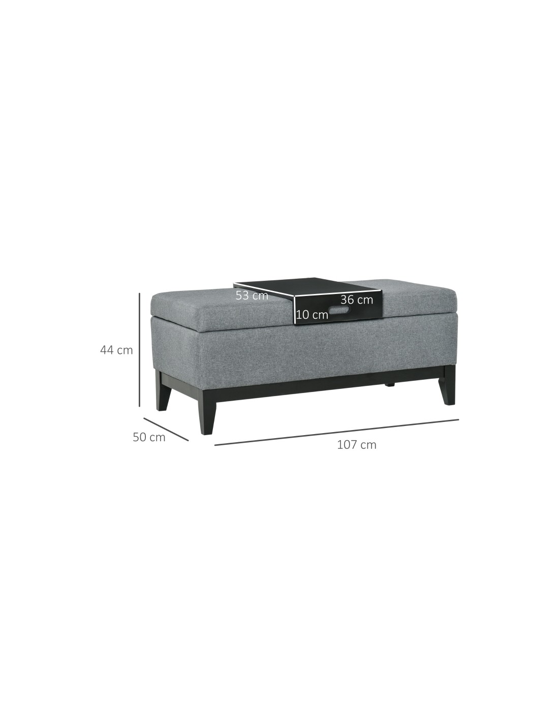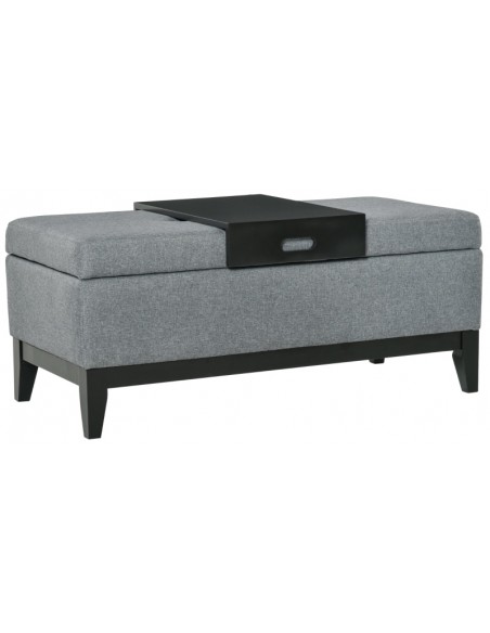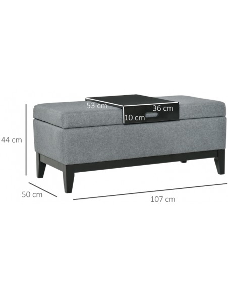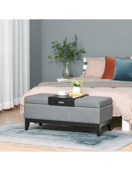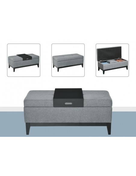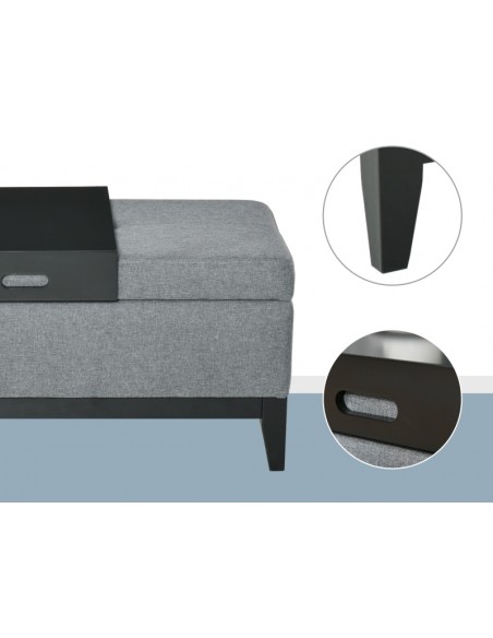 Bænk med opbevaring og bakke, udført i et design af velpolstret polyester og med ben i træ. Bænken måler 107 x 50 cm i bredde og dybde.