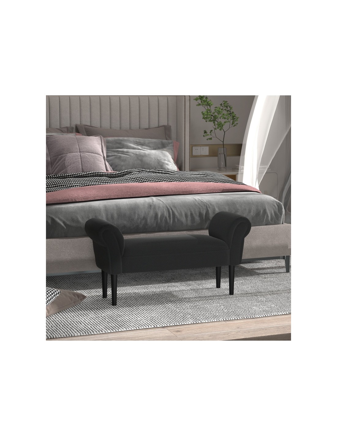 Bænk udført i et design af velpolstret polyester og med ben i træ. Bænken måler 102 x 31 cm i bredde og dybde.