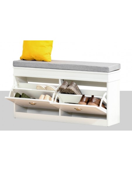 Bænk med skoskabe, udført i et design af møbelplade, mdf og polstret polyester. Bænken måler 104 x 24 cm i bredde og dybde. Skoskabene kan rumme op til 8 par sko, afhængig af størrelsen på skoene.